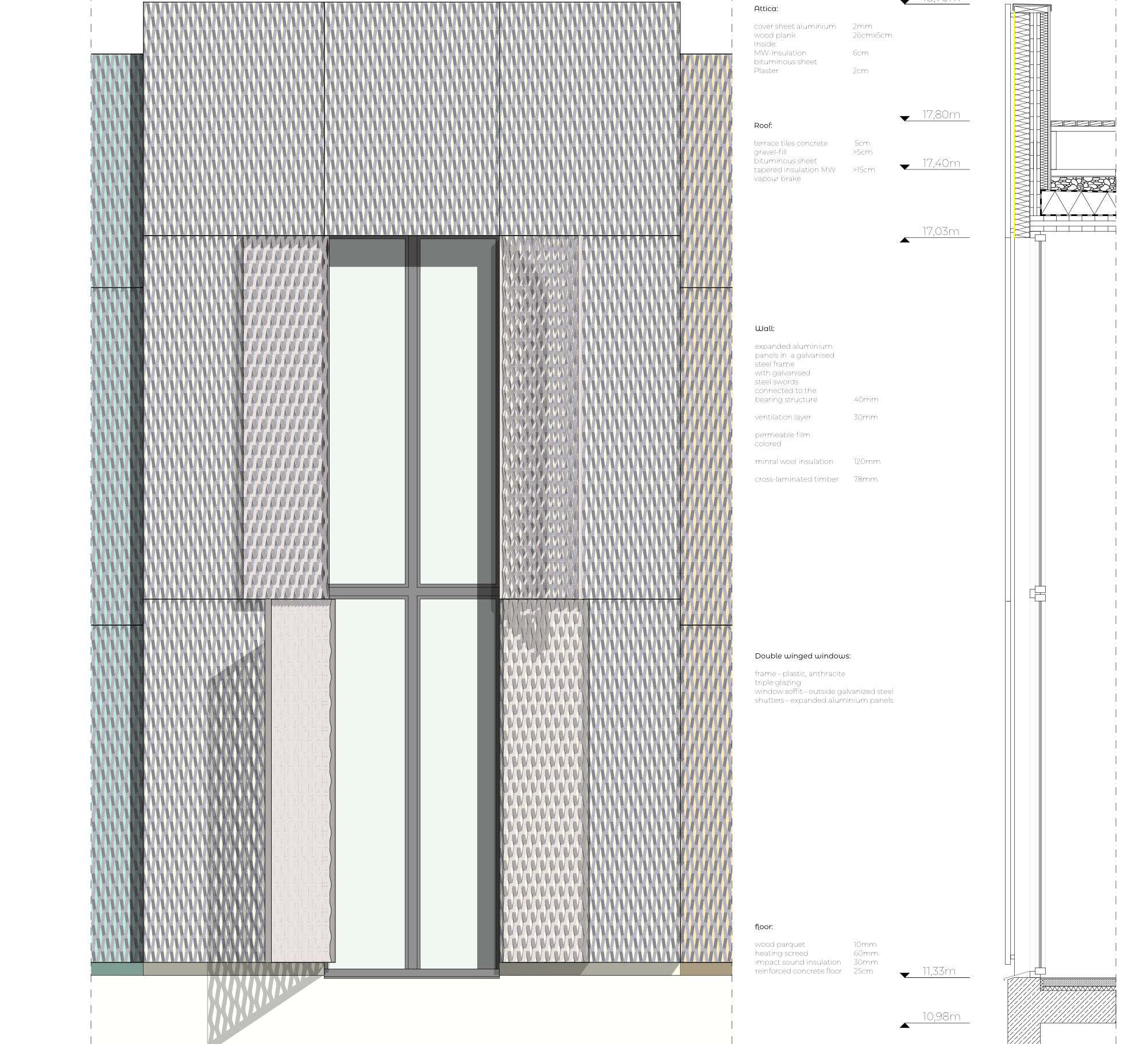 Die ursprünglicher Brüstung des Bestandes bleibt erhalten und wart so das Erscheinungsbild des Gebäudes. Dieser Bereich dient nun der Verteilung von Lasten und der Gebäudetechnik.
