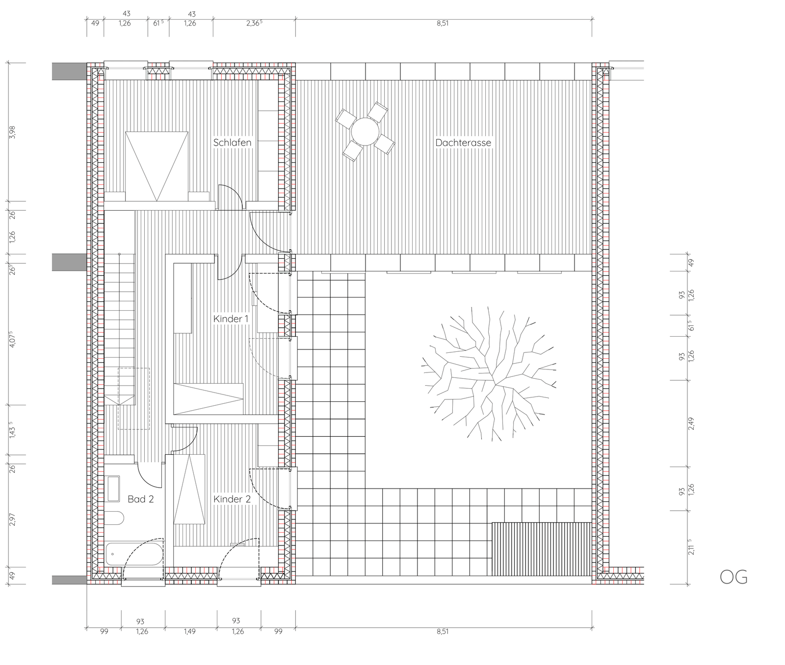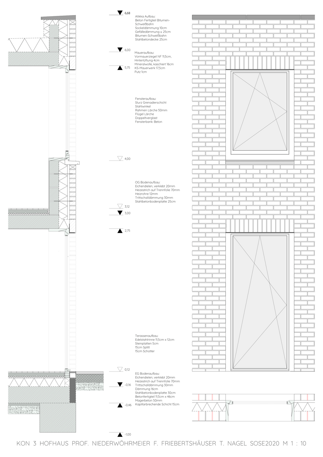 Die Außenhülle setzt sich aus Vormauerziegeln, Dämmung und Kalksandsteinmauerwerk zusammen. Dadurch werden moderne Dämmwerte mit rustikaler Optik verbunden. Eine Besonderheit sind die Grenadierstürze über den Öffnungen, welche mit sichtbaren Stahlwinkeln gehalten werden. Inspiration dafür war Mies van der Rohes Haus Lange in Krefeld.