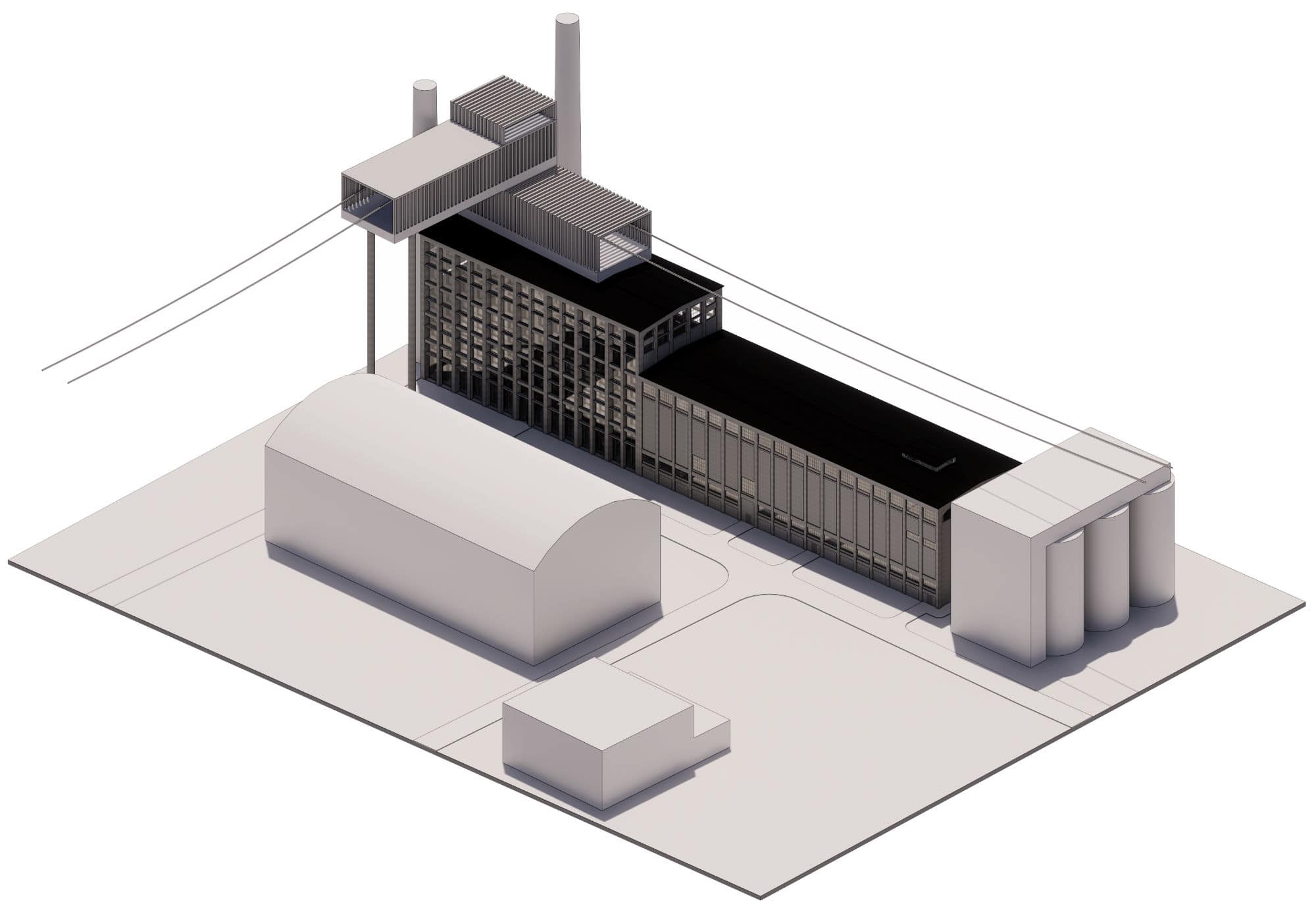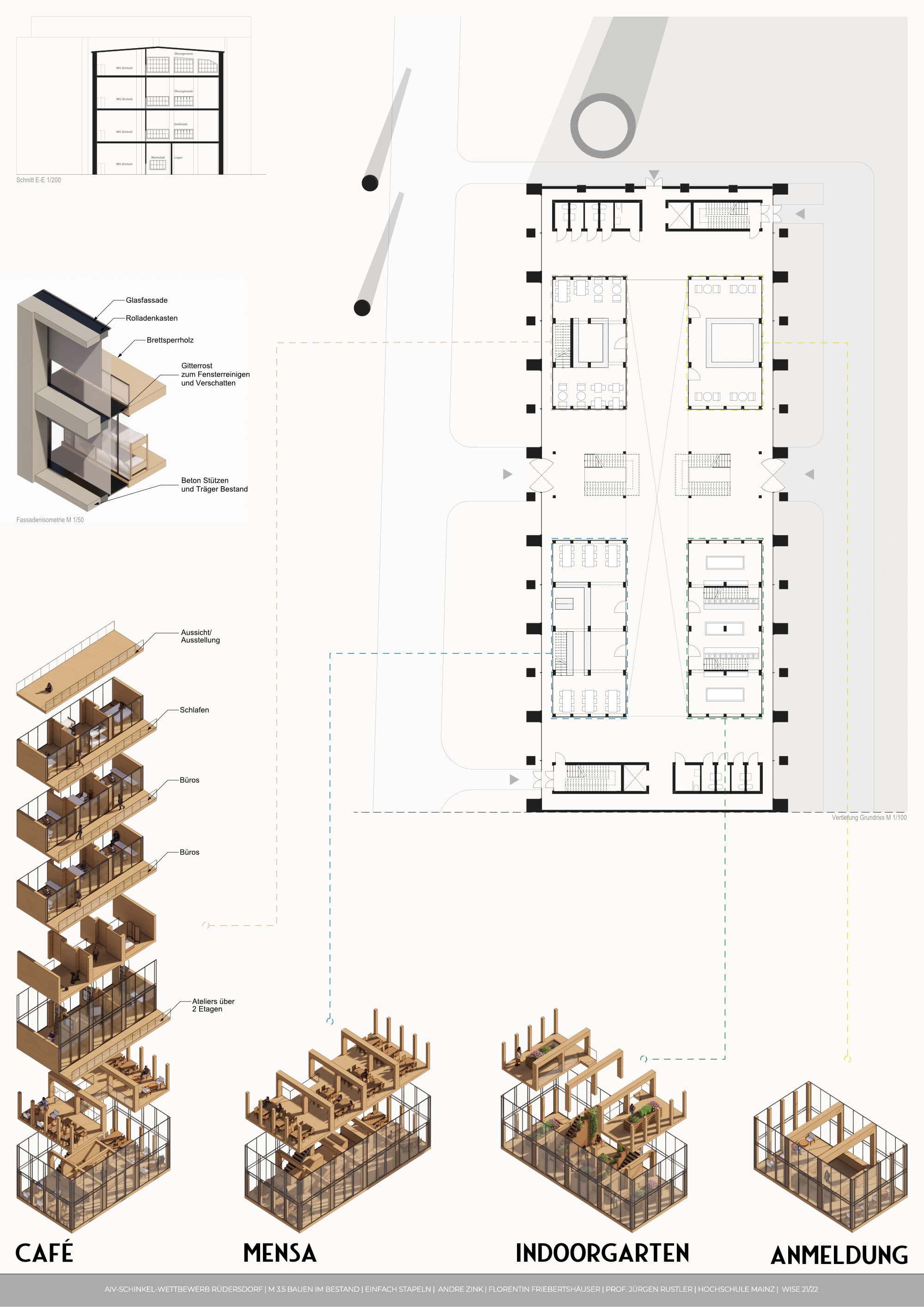 Dem höheren Gebäudeteil sind 4 Bauvolumen eingestellt, welche dann mit Ateliers, Büros und Schlafräumen aufgestapelt wird. Die Mauerwerksausfachungen des Bestandes werden hier durch eine Glasfassade ersetzt, um den Raum mit Licht zu fluten. Im niedrigeren Gebäudeteil ist ein flexibler Veranstaltungsbereich untergebracht.