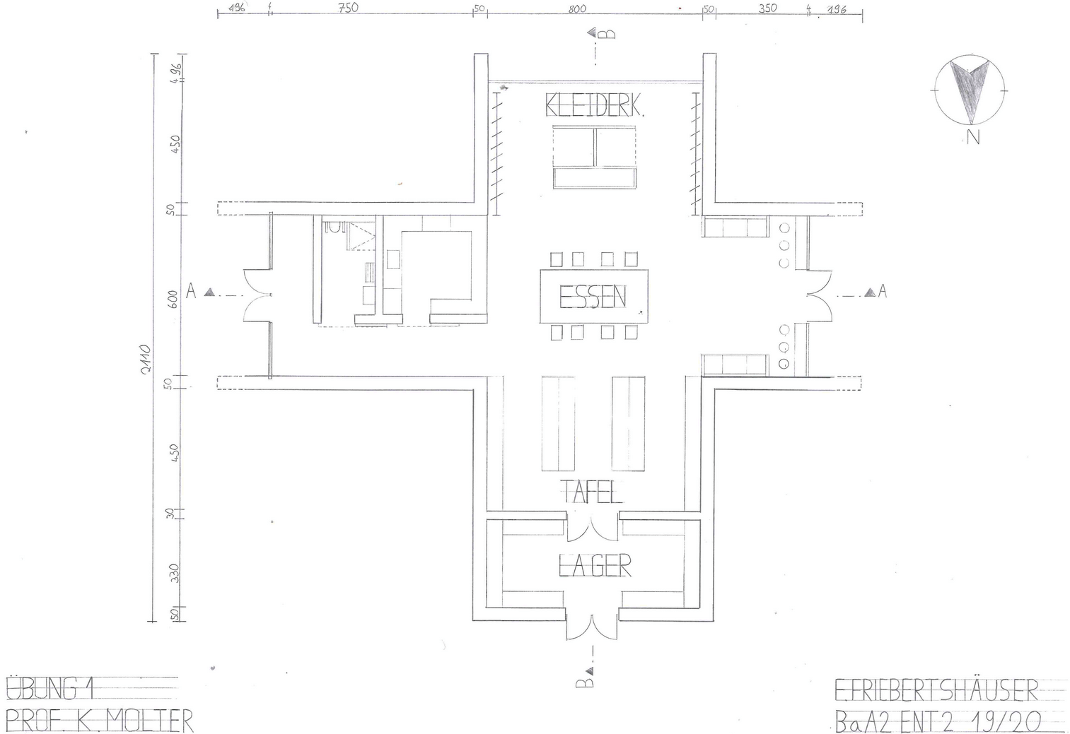 Die Aufgabe: ein Gebäude mit einer Tafel und einer Kleiderkammer. Um meinen Entwurf abzurunden, schuf ich zusätzlich einen sozialen Treffpunkt. Das fiktive Grundstück liegt am Stadtrand. Hinten raus lädt ein Wald zum Wandern und Erholen ein.