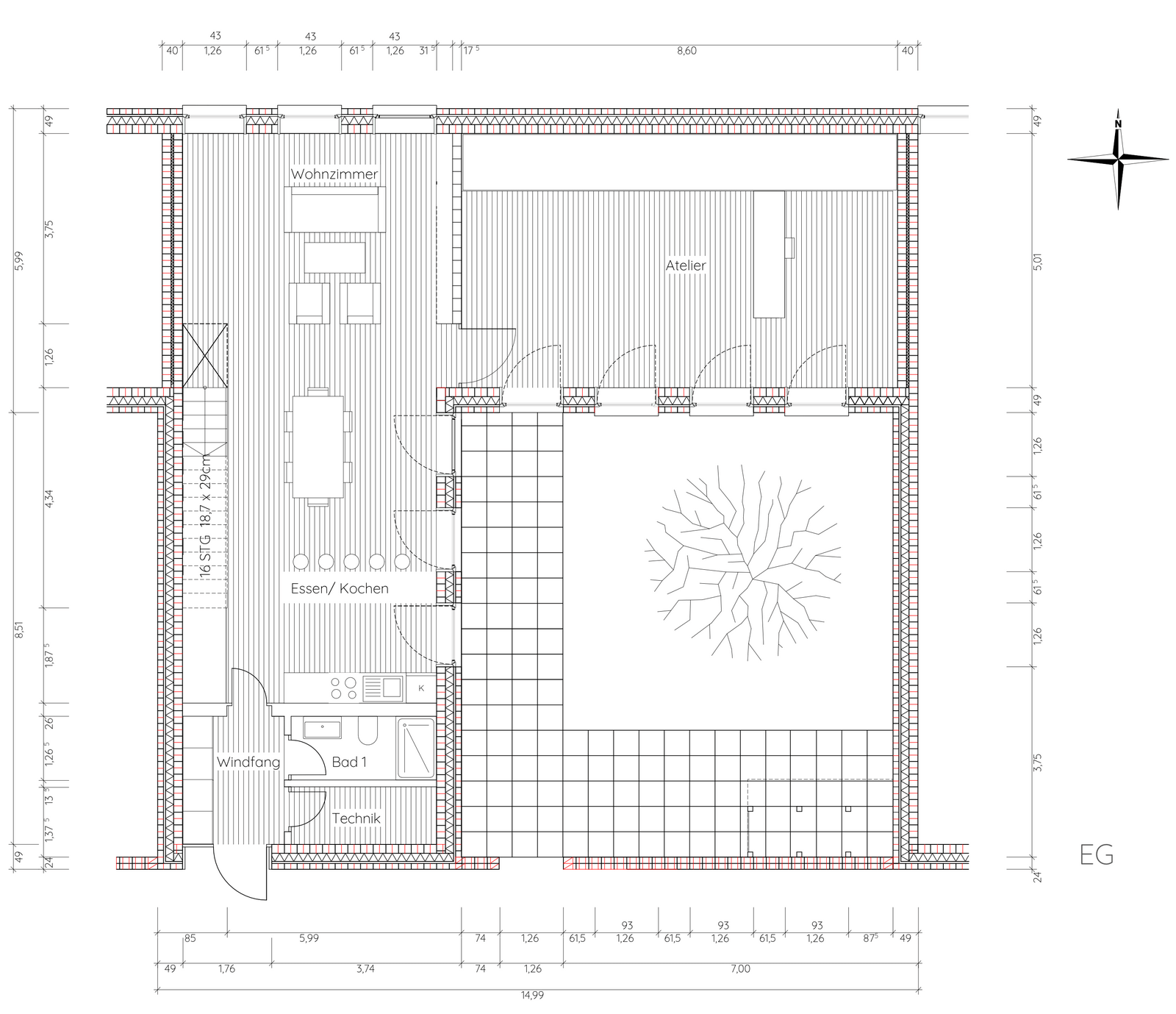 Die Fassade des Gebäudes wirkt durch das feine Mauerwerk detailliert und rustikal. Grenadierstürze über den Öffnungen verstärken diese Wirkung. Zum Garten hin sind vom Wohnbereich aus bodentiefe Fenstertüren vorgesehen.