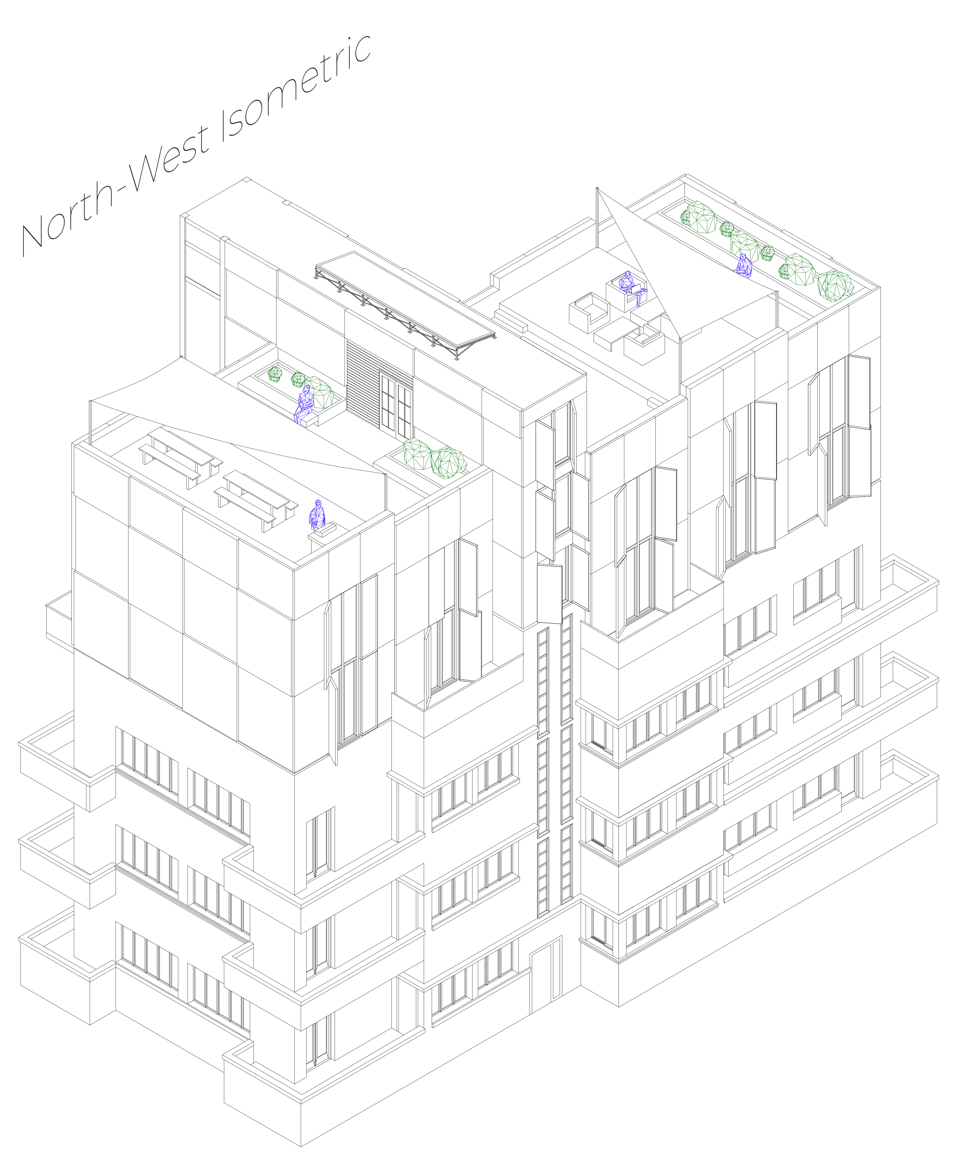 Die Aufstockung besteht aus 5 Maisonetten. Der mittige Riegel wird zur Erschließung genutzt und um einen Aufzug ergänzt.