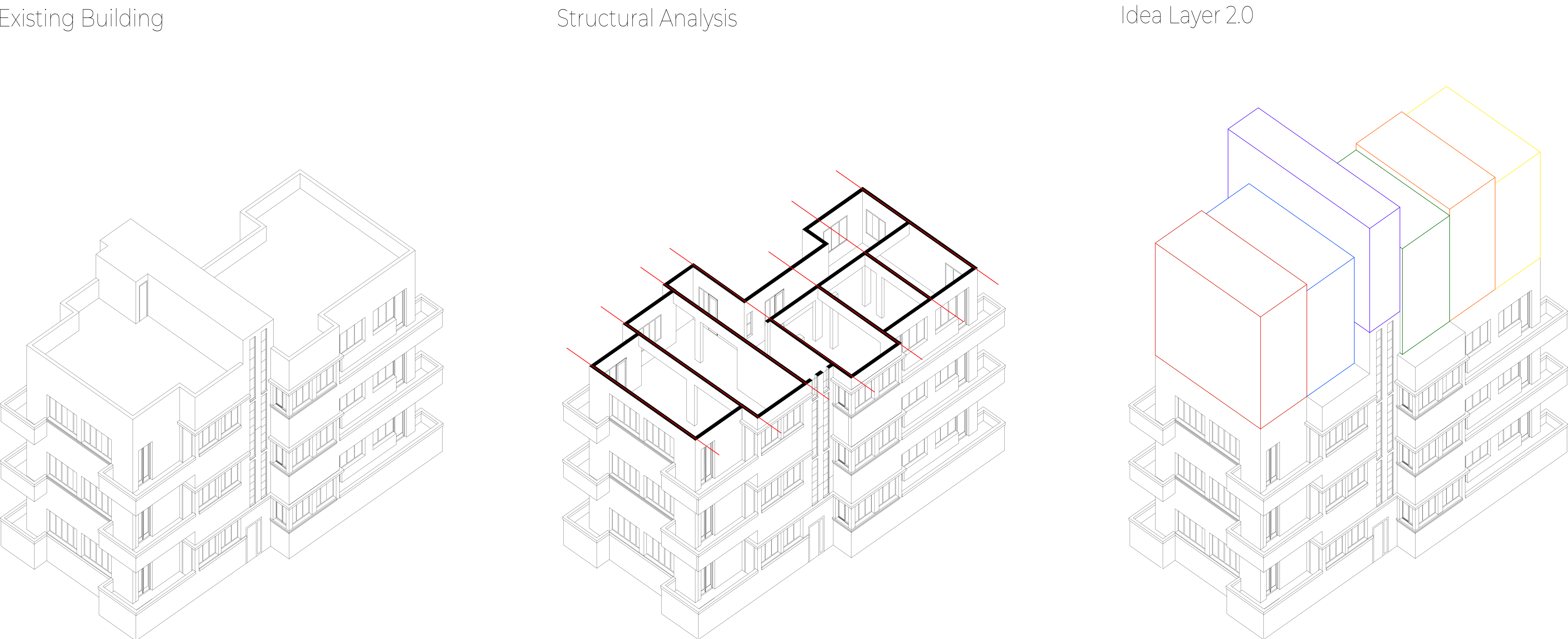 Im linken Piktogramm sieht man das Bestandsgebäude, dessen Struktur und meine Grundidee.