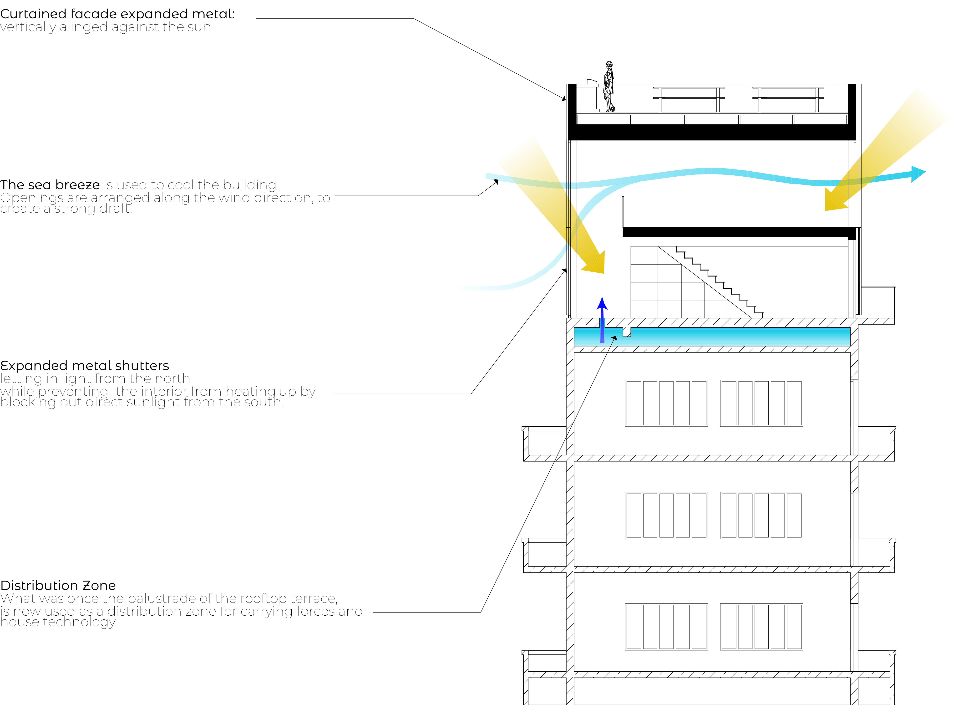 Um das Querlüften möglichst effizient zu gestalten, sind die Öffnungen an den Stirnseiten angeordnet, sodass ein stärkerer Durchzug erfolgt. Zudem sind die Riegel entlang der kühlen Meeresbrise orientiert, welche nun ungehindert die Wohnung durchdringen kann.